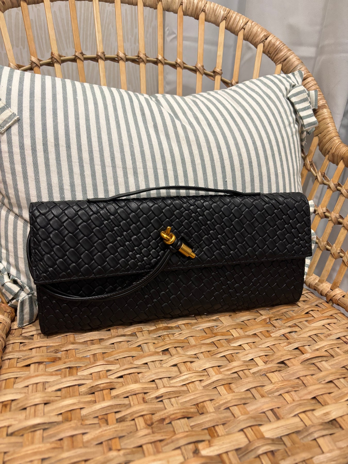 Elevate your look with this stunning embossed weave knot clutch—an eye-catching piece that blends elegance with everyday ease. The detailed woven texture gives it a high-end feel, while the charming knot design adds a soft, stylish touch that sets it apart.