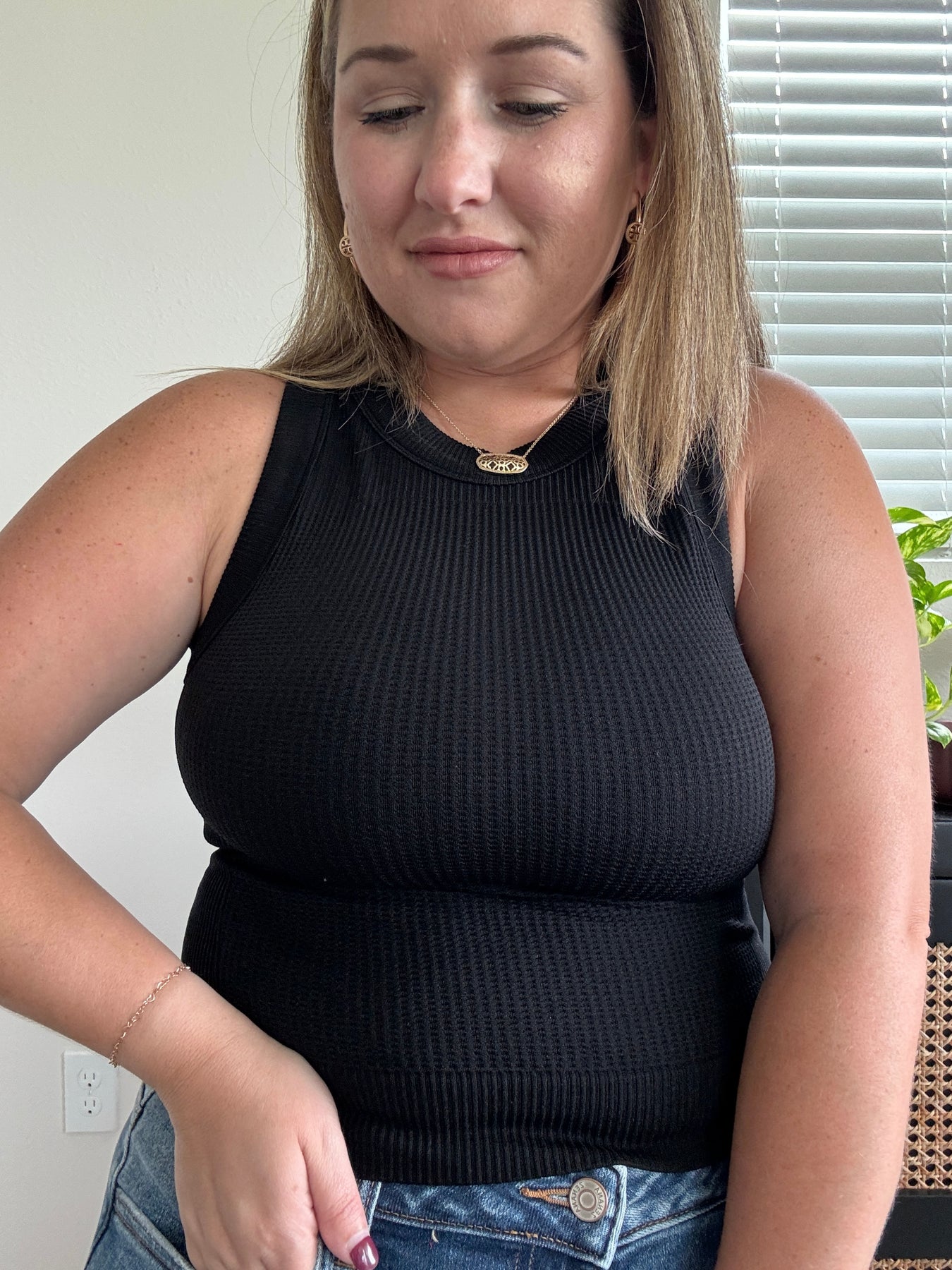 The cropped length pairs effortlessly with high-waisted jeans or leggings, giving you a flattering and streamlined look. Whether you wear it as an under layer or on its own, this tank offers versatility and comfort that’s perfect for all-day wear.
