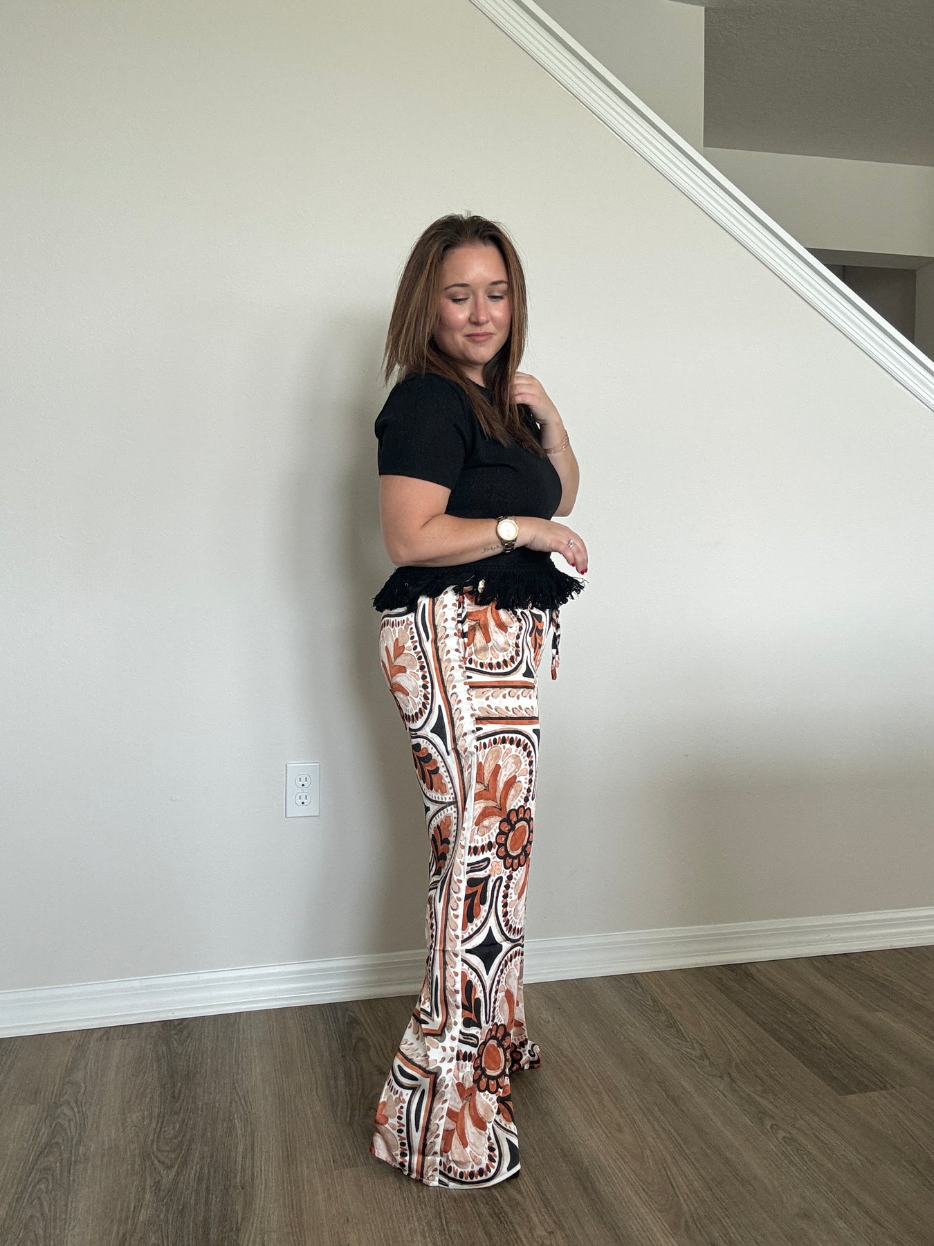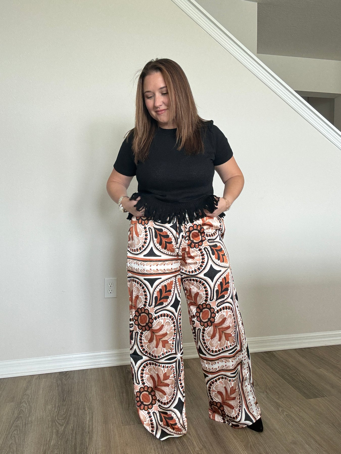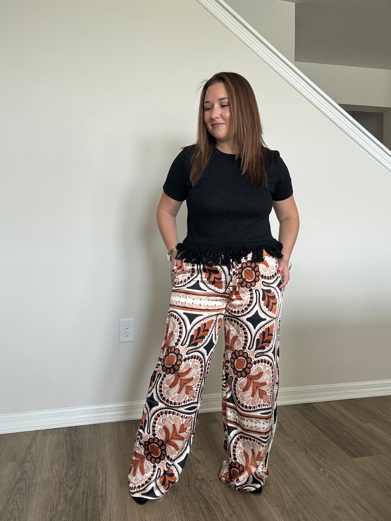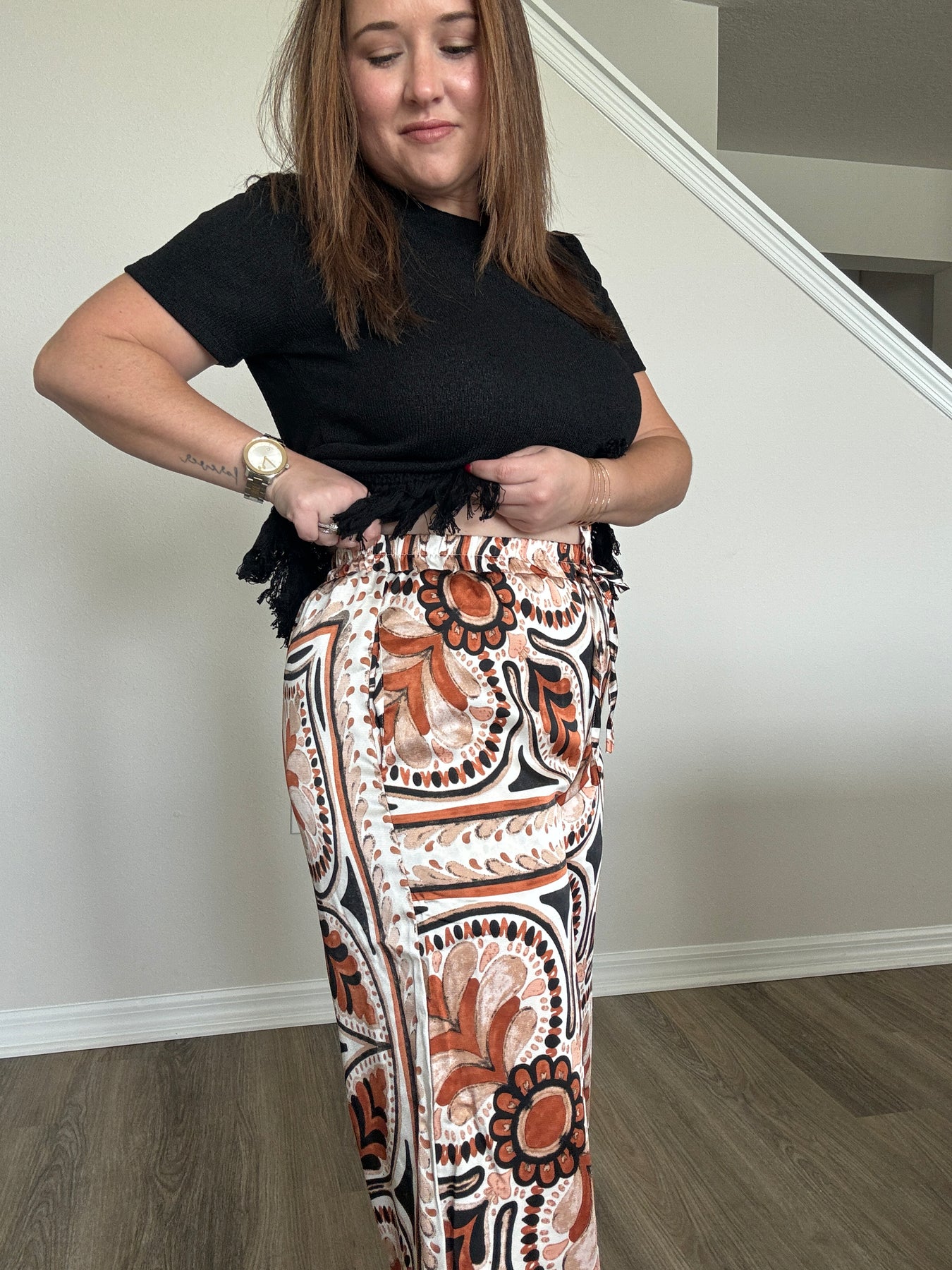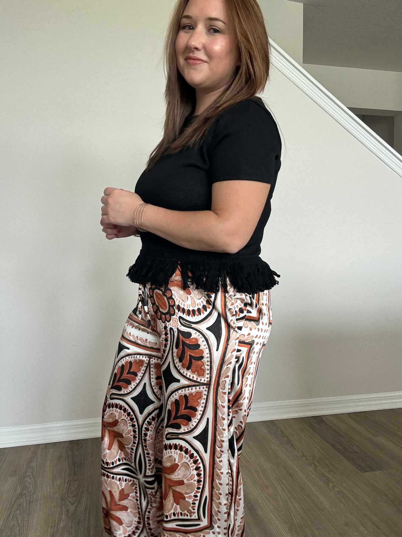 Elevate your everyday style with these stunning Satin Border Print Wide Leg Pants. Made from a silky satin fabric that drapes beautifully, this pair brings effortless elegance to your wardrobe without sacrificing comfort. The relaxed wide-leg silhouette feels airy and flattering, while the elastic waistband gives you an easy, comfortable fit that moves with you all day long.