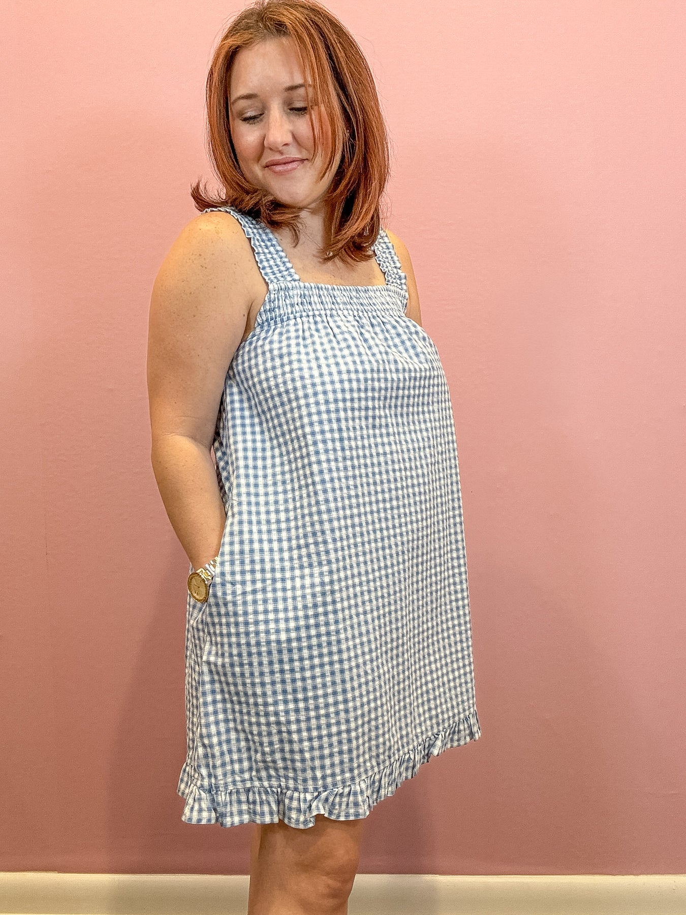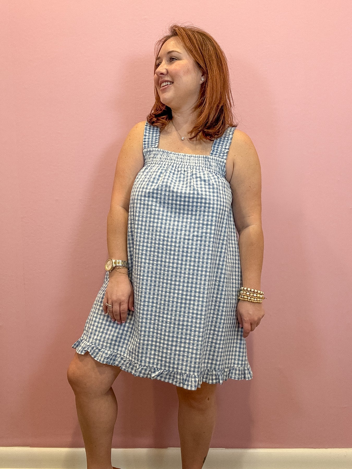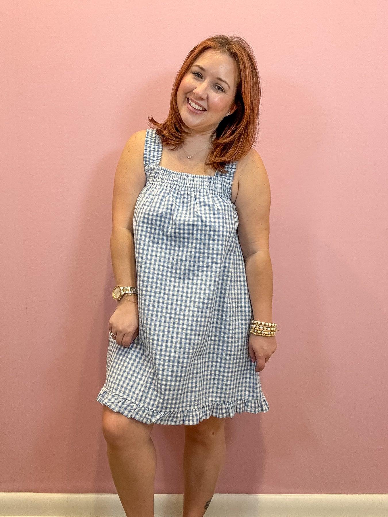 Embrace a sweet, vintage-inspired style with the Back Tie Smocked Yoke Ruffle Hem Dress. Featuring a classic gingham pattern, this dress adds timeless charm to your wardrobe. The smocked yoke offers a comfortable, flattering fit, while the back-tie detail provides a customizable touch. Finished with a playful ruffle hem, it’s perfect for picnics, garden parties, or any sunny day outing.