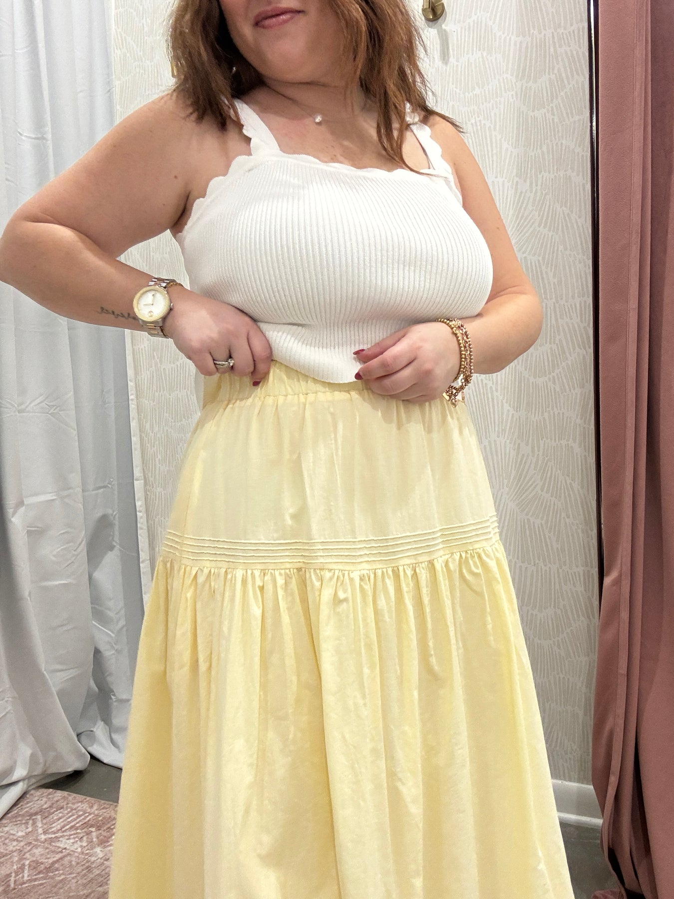 This skirt pairs perfectly with a simple tank, a lightweight sweater, or a tucked in blouse. It is easy enough for daytime plans and special enough for gatherings, church, or weekend outings. A true closet staple you will reach for season after season.