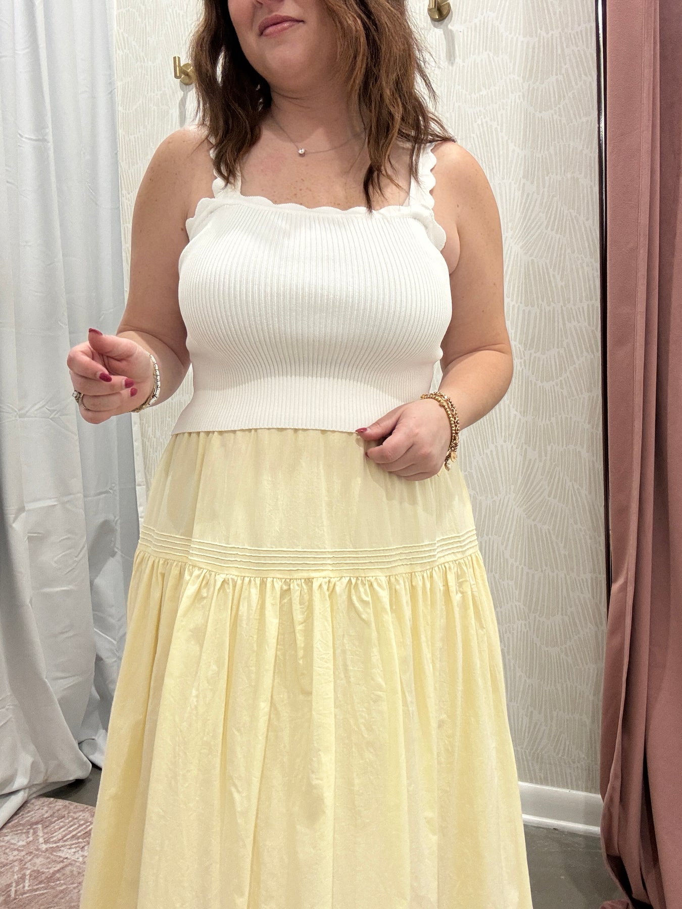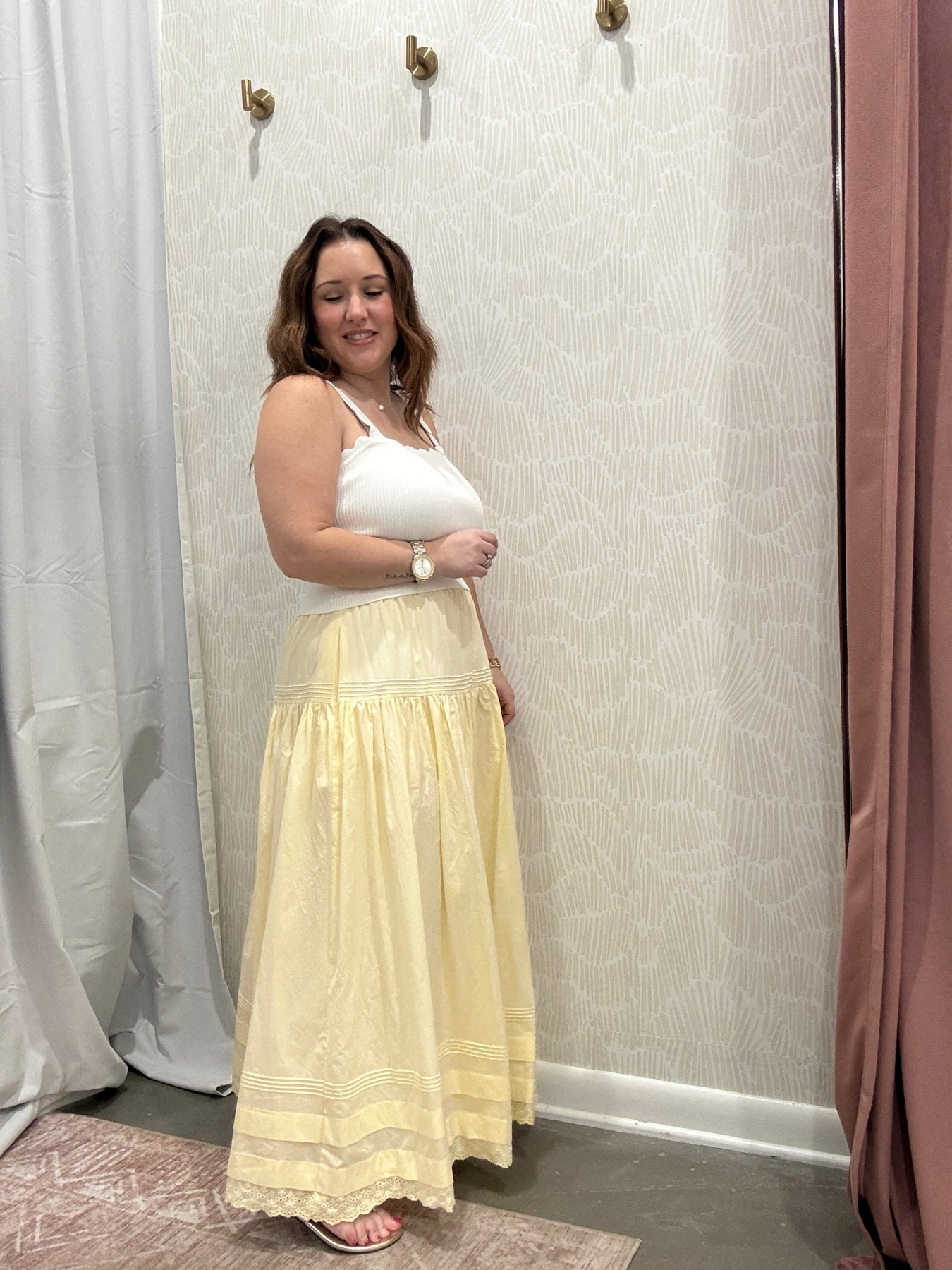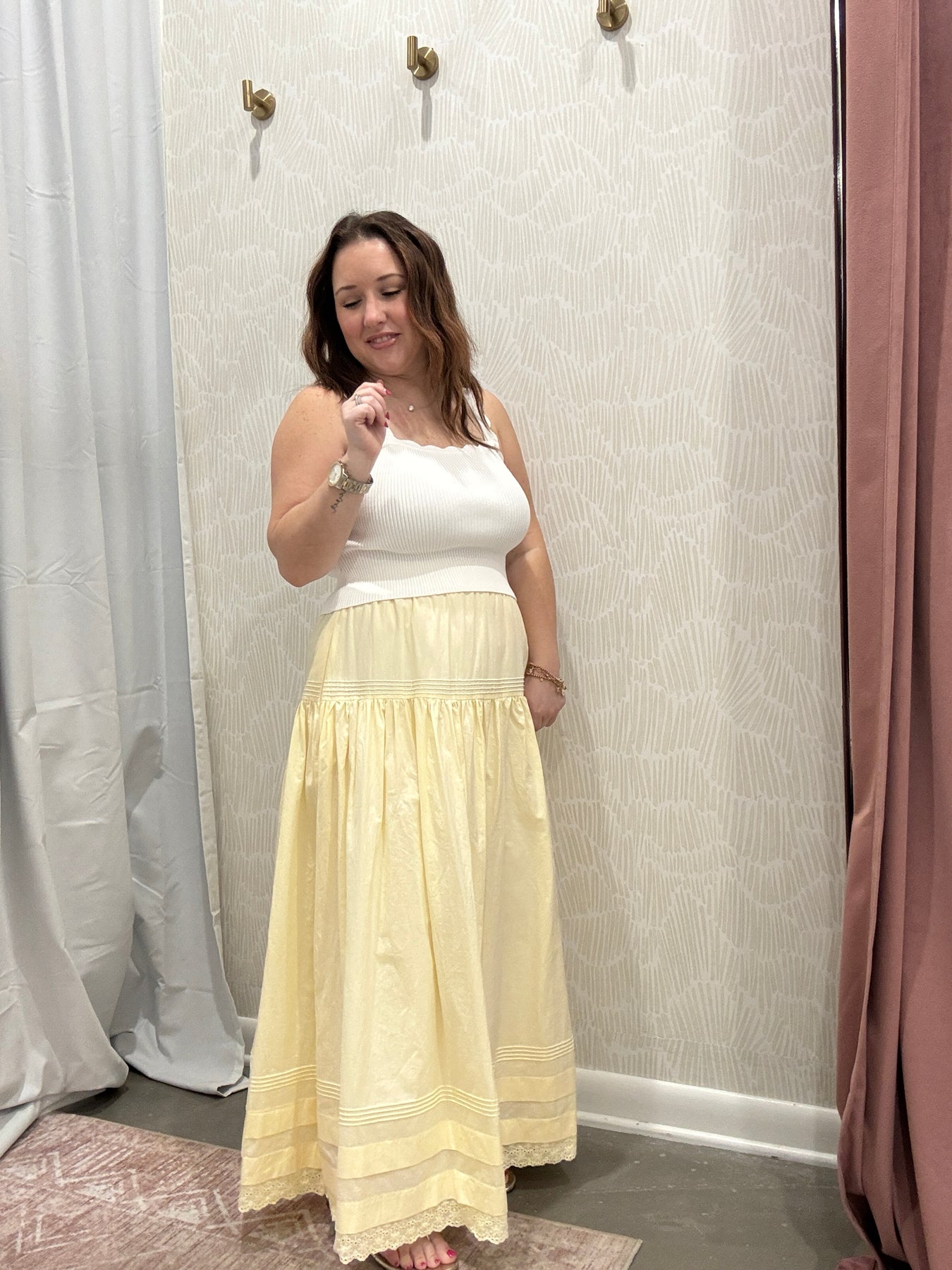 This is the kind of skirt that feels timeless the moment you put it on. The Tiered Pintuck Eyelet Lace Trimmed Midi Skirt is feminine, easy, and designed to move beautifully with you through everyday life.