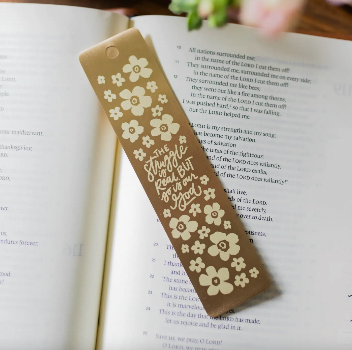 - This is a 4.5” brass ruler bookmark with laser imprinting, which reads: “The struggle is real but so is our God"