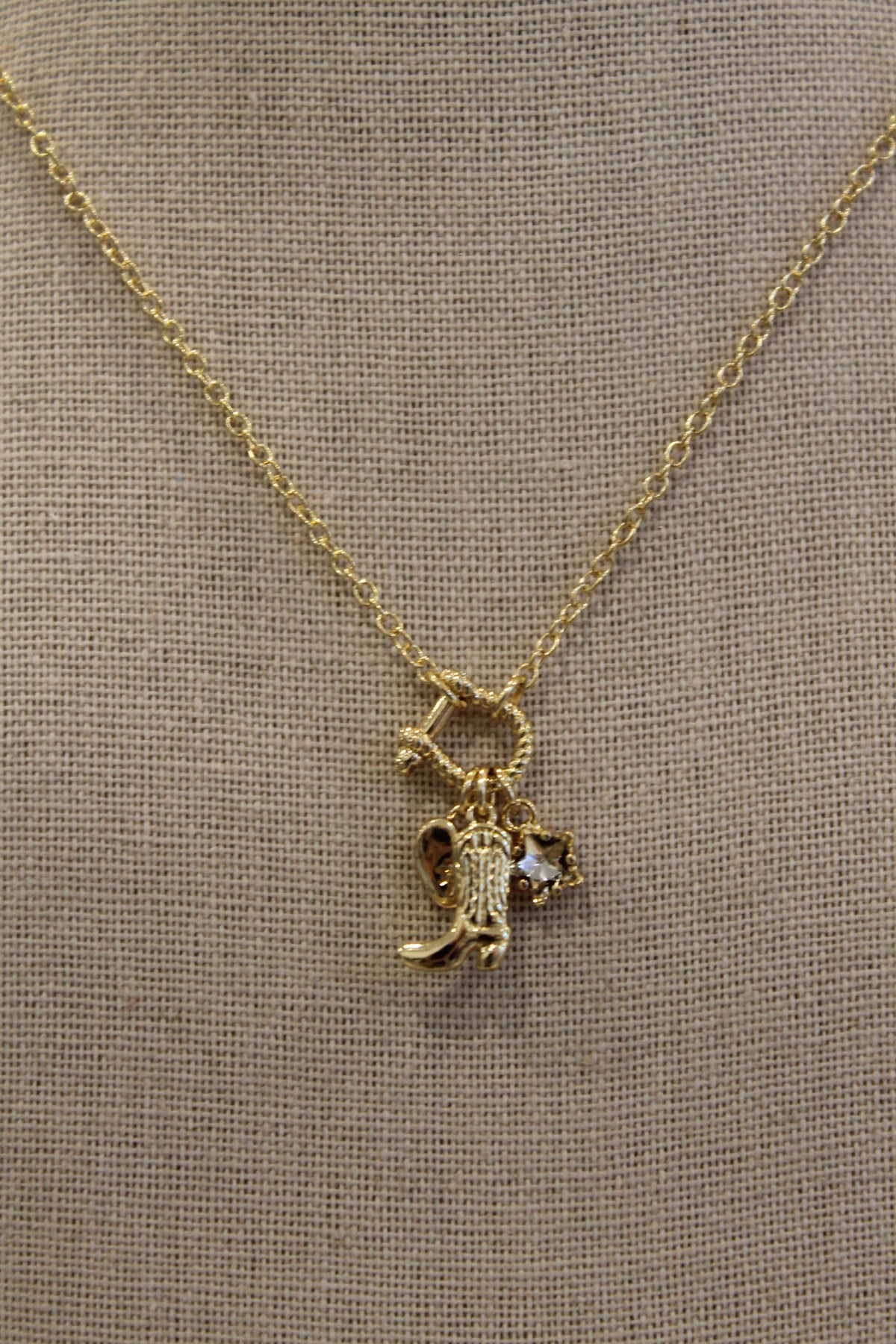 Add a little charm and personality to your style with this western cowboy boot and heart charm chain necklace. Blending elegance with a hint of western flair, this piece brings a touch of glamour to any look.