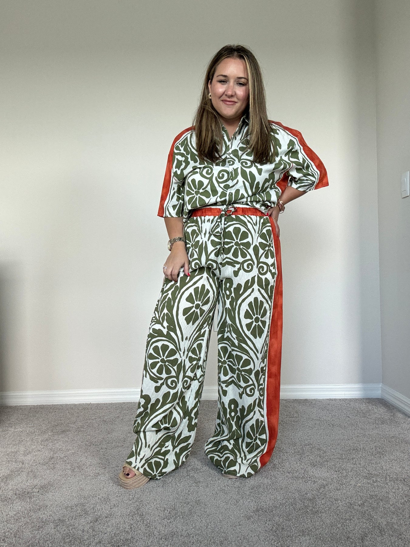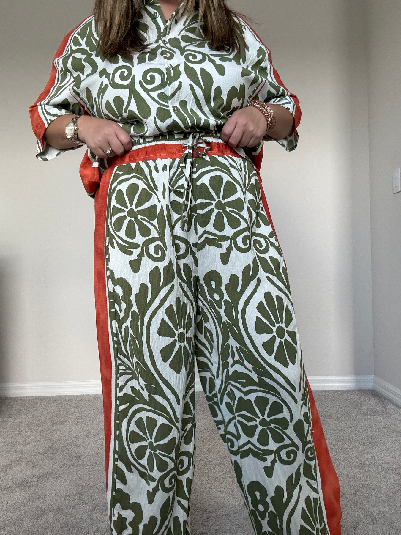 Step into effortless style with these bold print pants, featuring a striking black-and-white pattern with an olive green contrasting stripe. The drawstring waist offers a comfortable, adjustable fit, while the relaxed silhouette makes them perfect for both lounging or dressing up.
