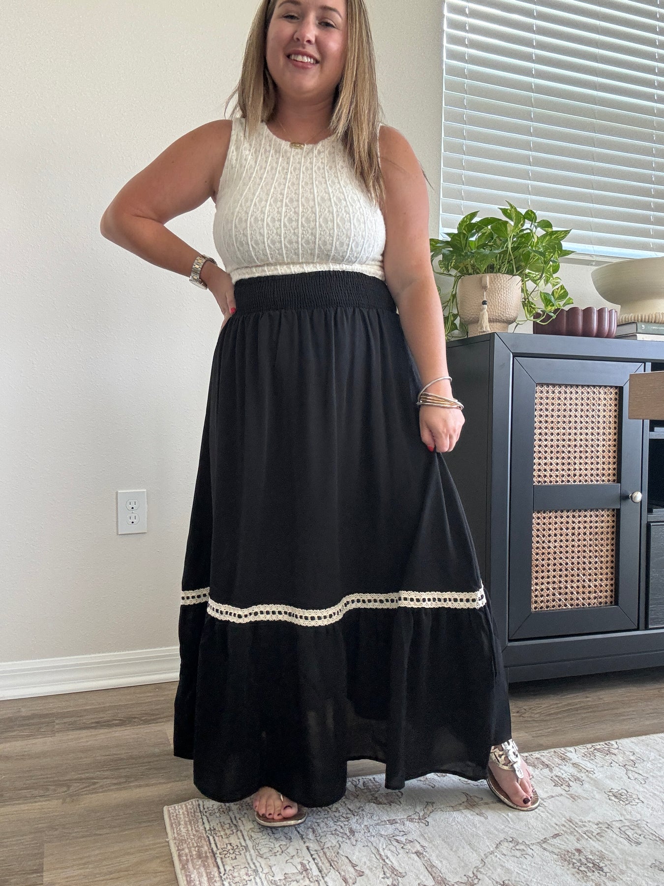 Elevate your wardrobe with this high-waist A-line midi skirt, designed to be effortlessly flattering. The smocked elastic waist ensures comfort, while the contrast lace trim with ribbon adds a delicate, feminine touch. Finished with a ruffle hem and fully lined for smooth coverage, this skirt is perfect for both everyday wear and special occasions.