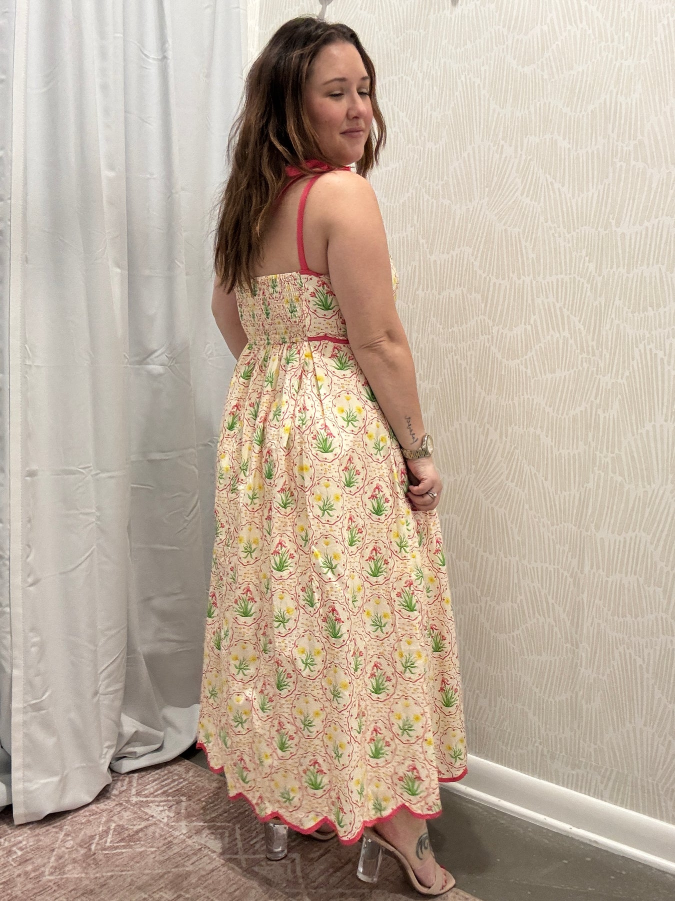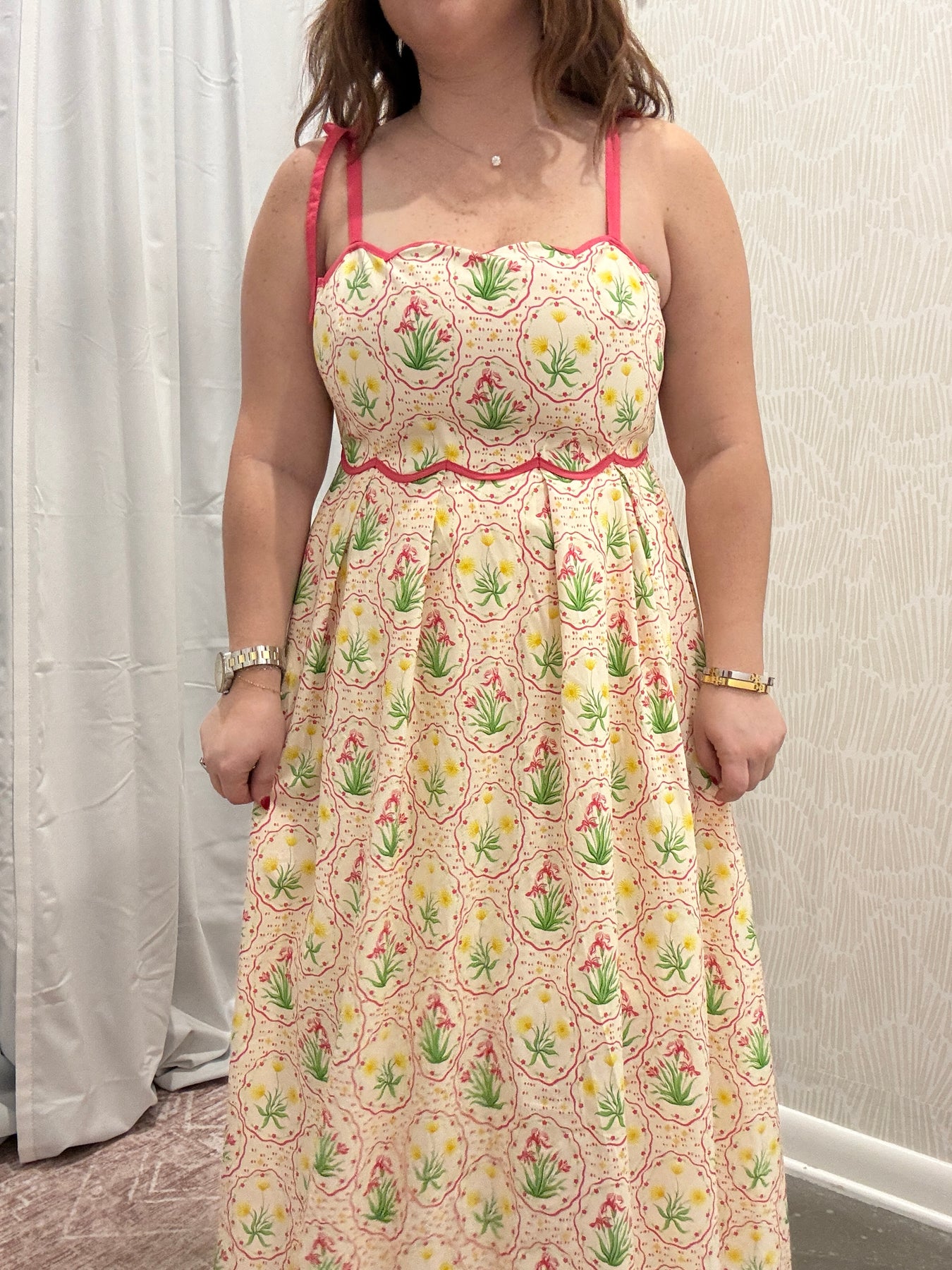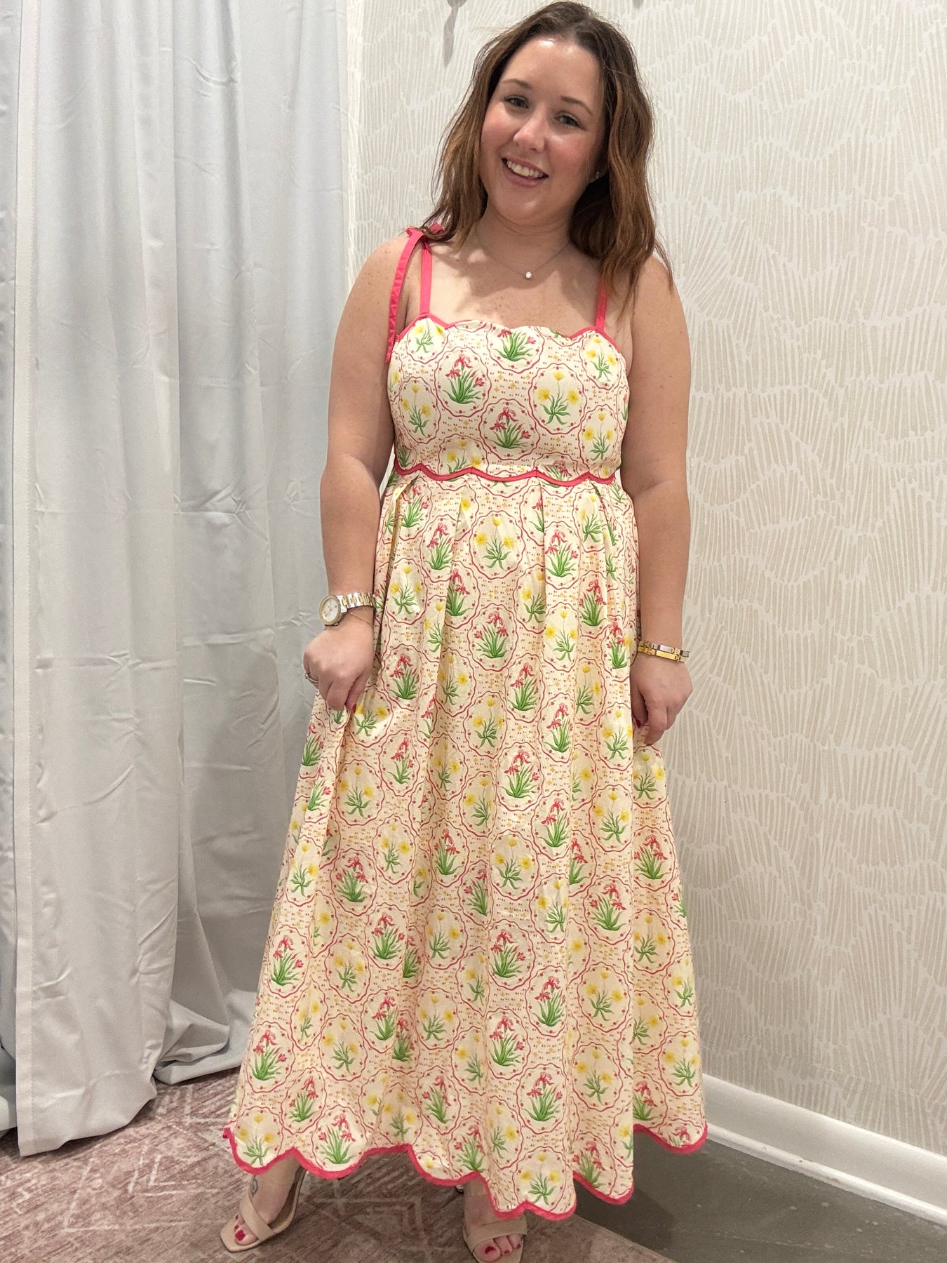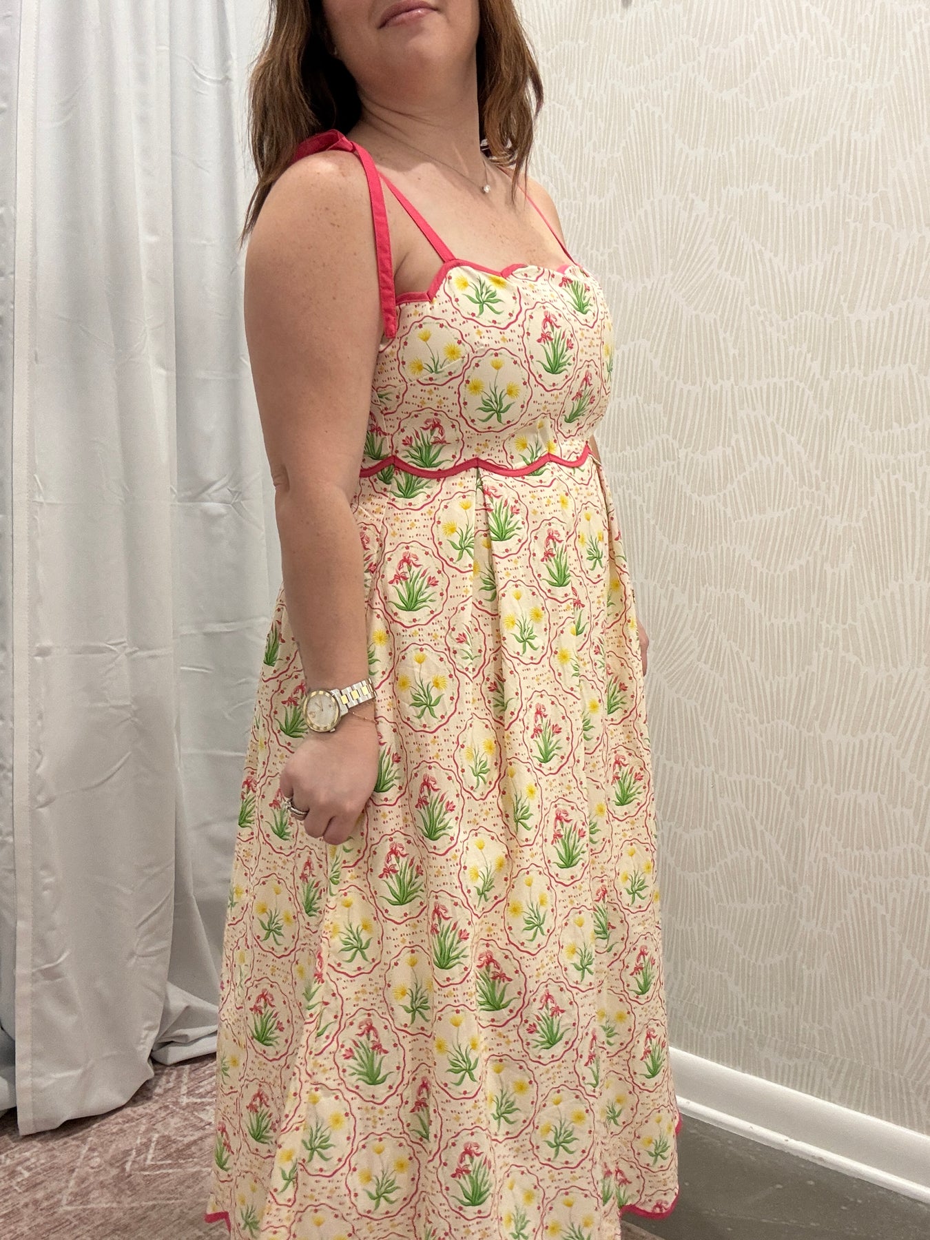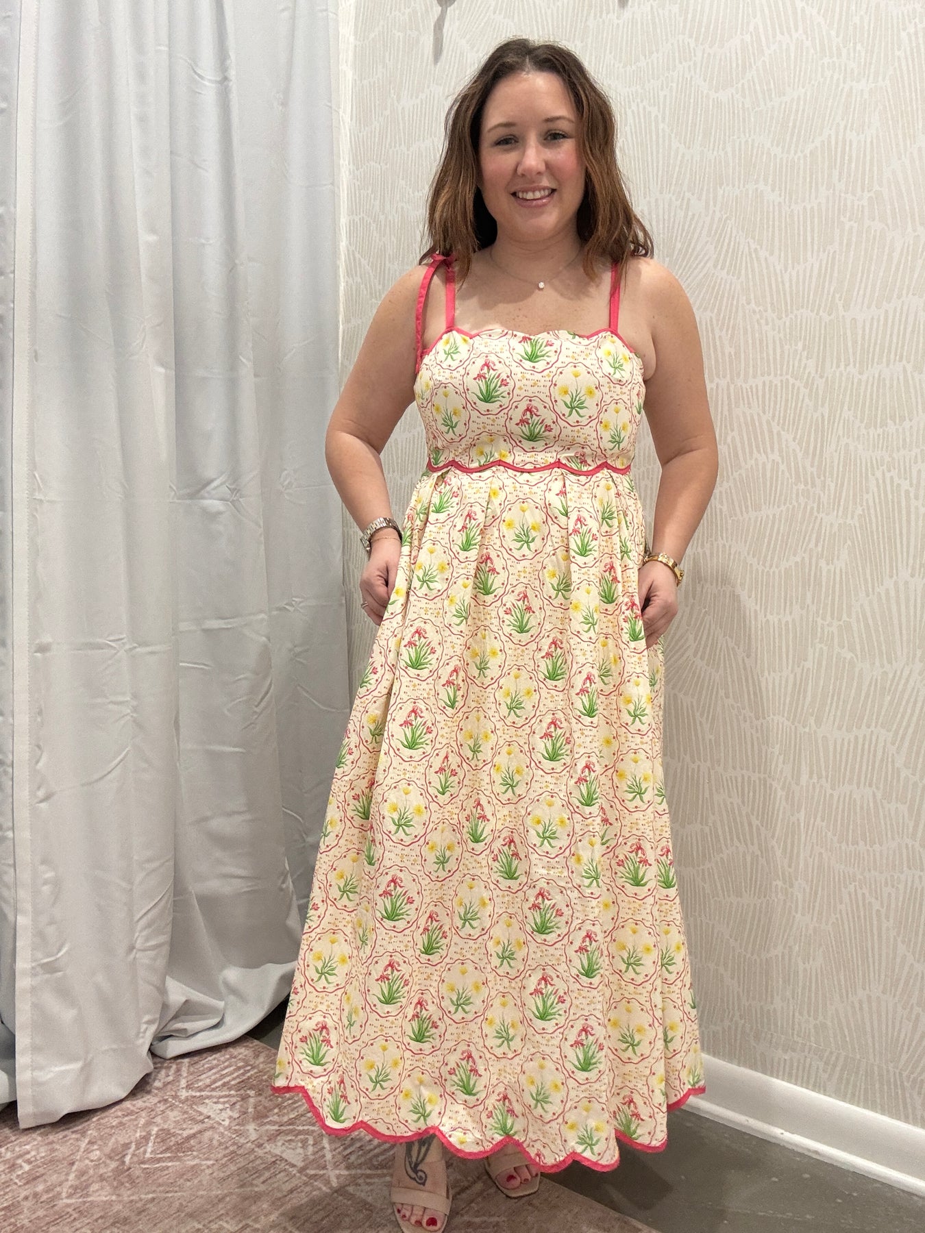 Soft, feminine, and made for sunny days, this floral print sleeveless midi dress is effortlessly charming. Designed with delicate scallop accent trim and adjustable tie shoulder straps, it brings a romantic touch while allowing for a customizable fit.