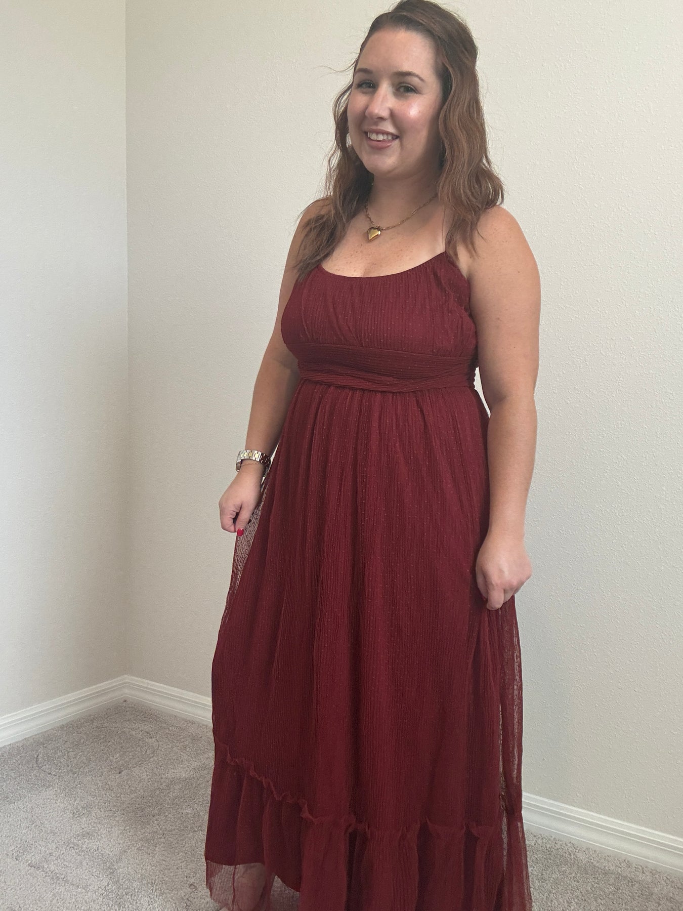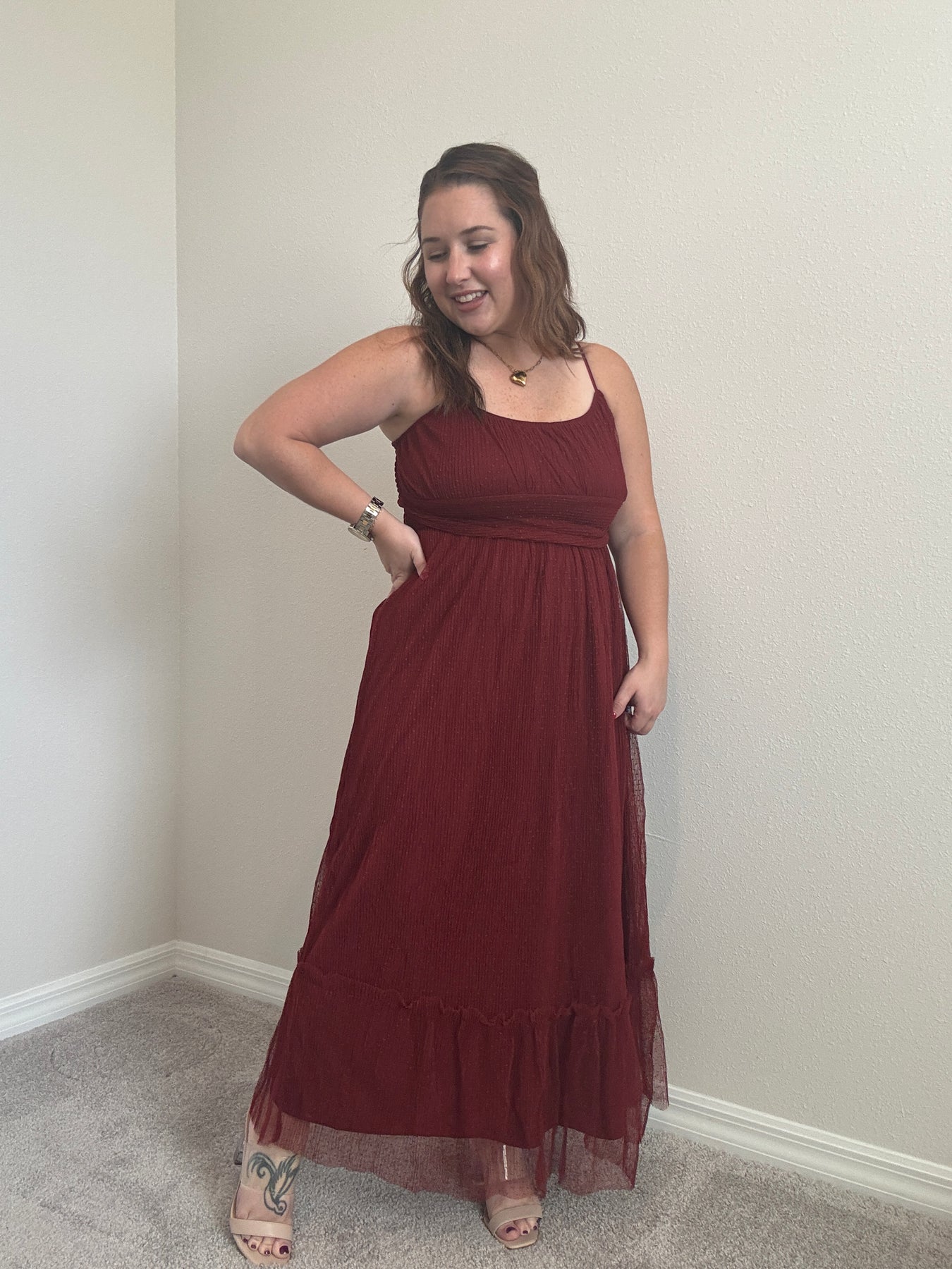 The delicate polka dot tulle overlay adds texture and whimsy, complemented by a graceful ruffle hem that sways beautifully with every step. Fully lined for comfort, this midi dress transitions effortlessly from brunch to date night, wedding events, or any special occasion.
