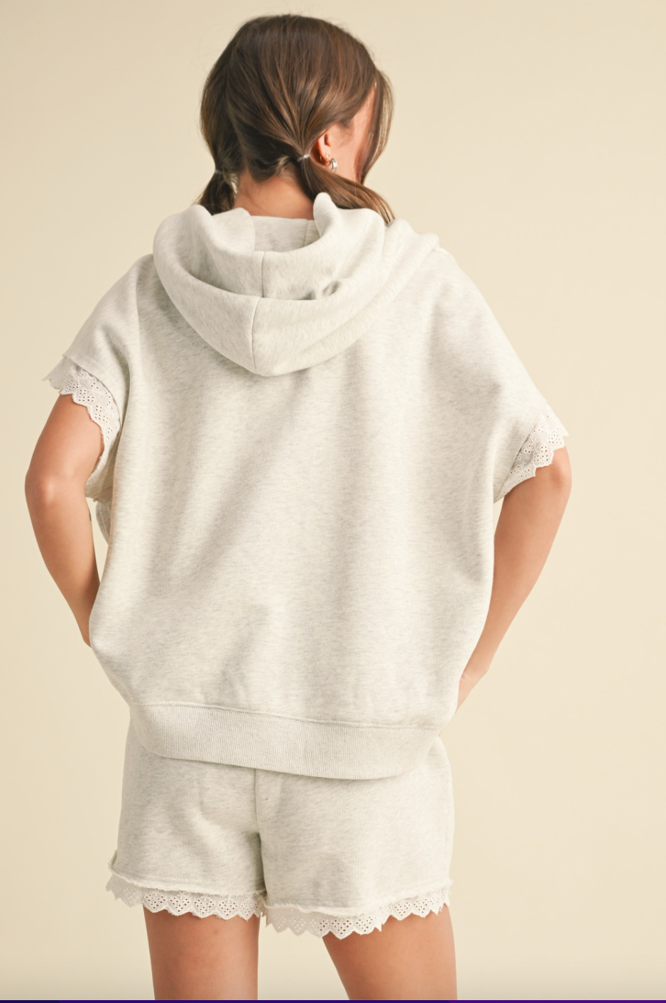 Stay comfortable and stylish with our Lace Trim Elastic Shorts. Pair them with the matching Short Sleeve Hoodie for a coordinated set, or mix and match with your favorite tee or tank for a relaxed, effortless look.
