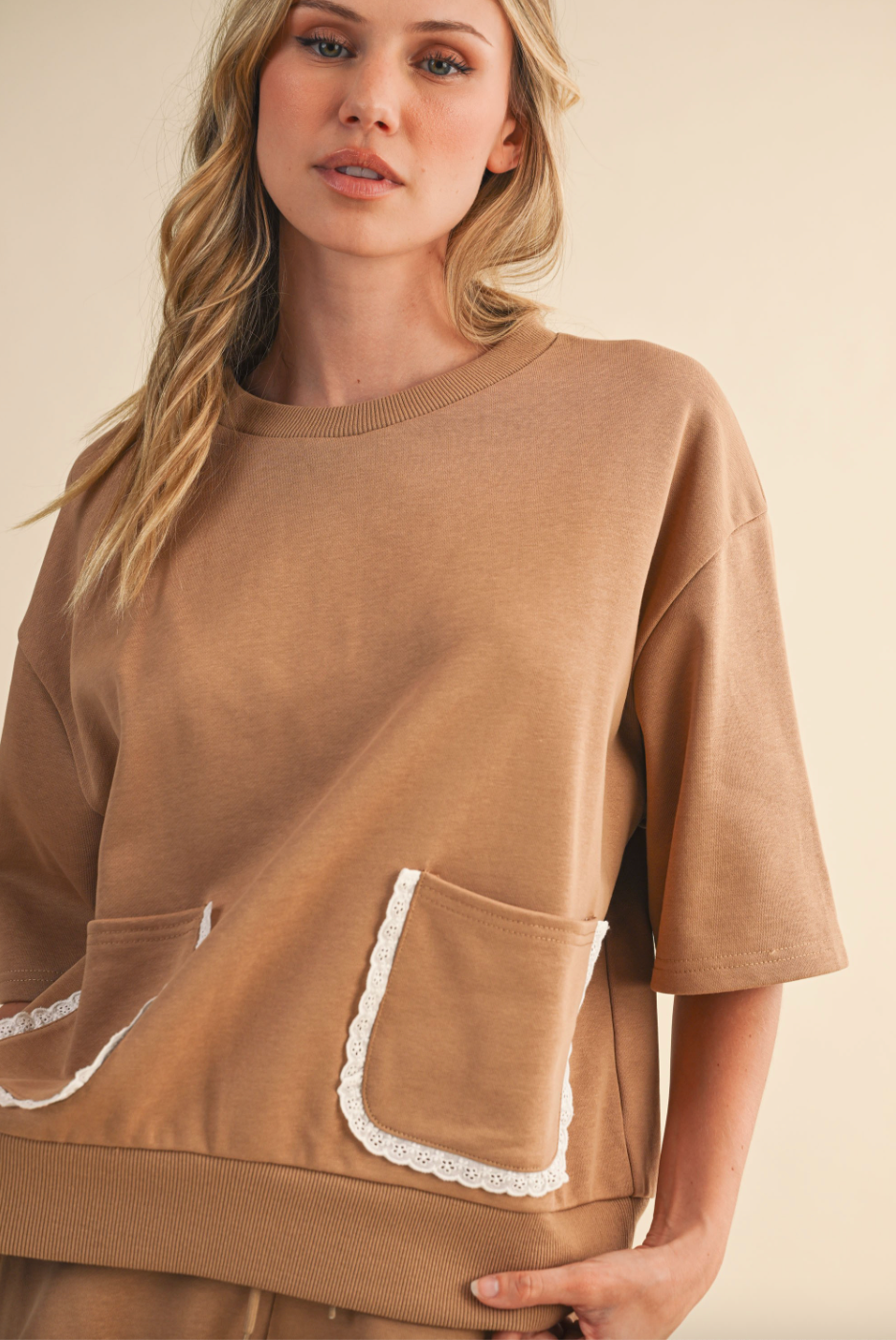 Add a touch of delicate charm with our Eyelet Lace Detail Short Sleeve Top. The intricate lace detailing keeps it feminine and timeless, while the relaxed fit makes it comfortable for everyday wear.