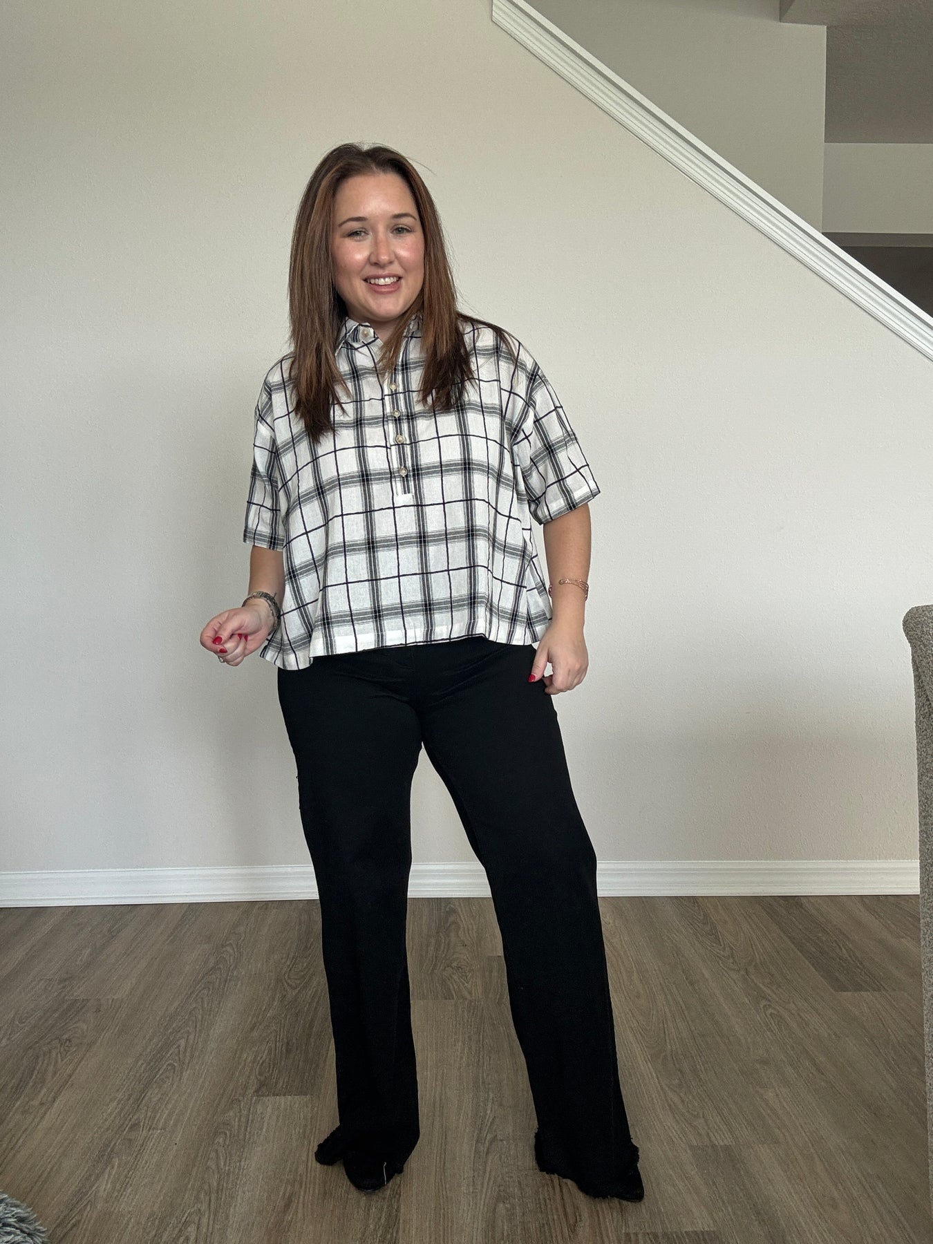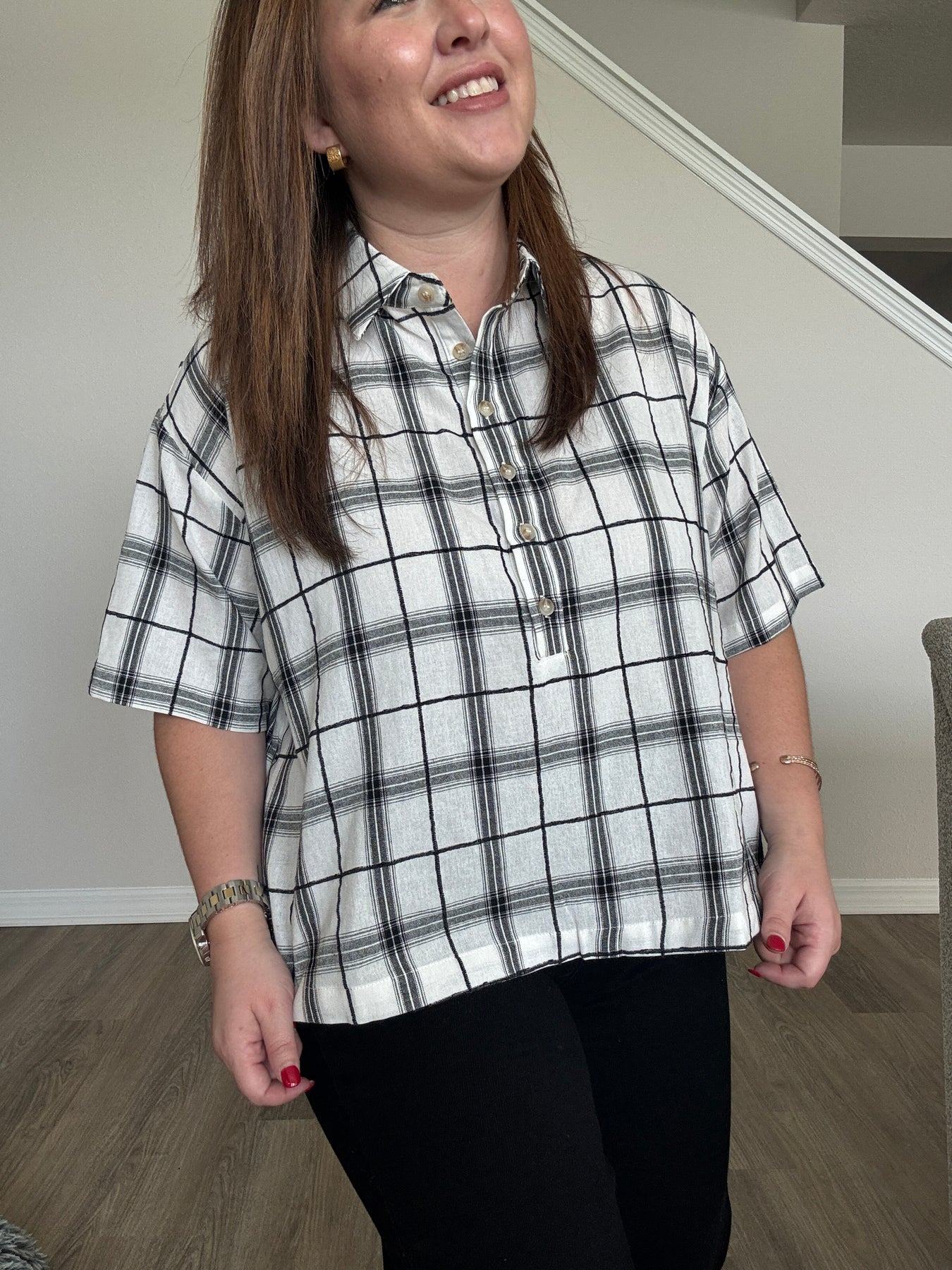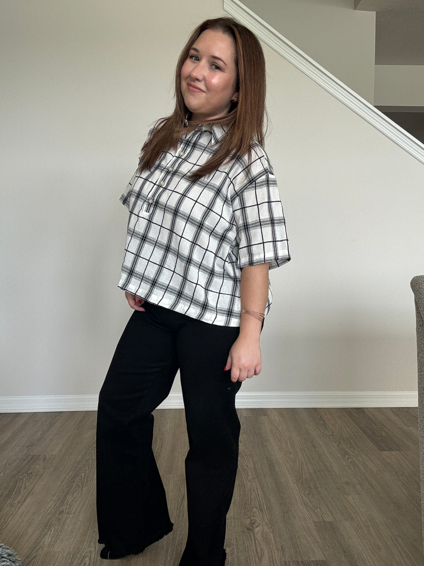 A modern take on a classic favorite, this Plaid Cropped Button-Up Top brings a fun, updated edge to your wardrobe. Designed with a relaxed, easygoing silhouette and a slightly structured collar, it blends timeless charm with contemporary style. The cropped length adds the perfect amount of playfulness, making it a standout piece you can dress up or down all season long.