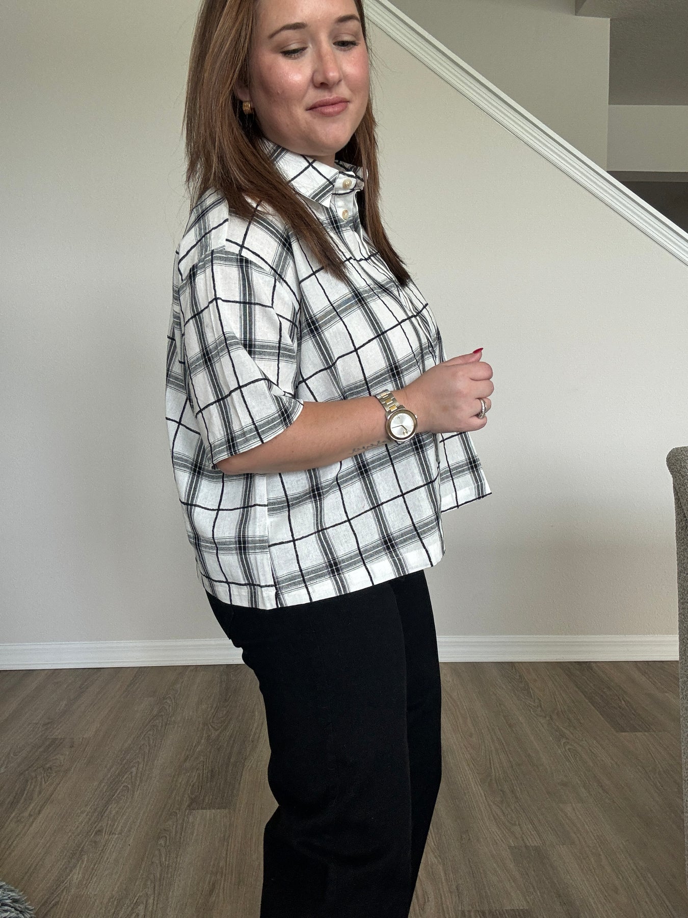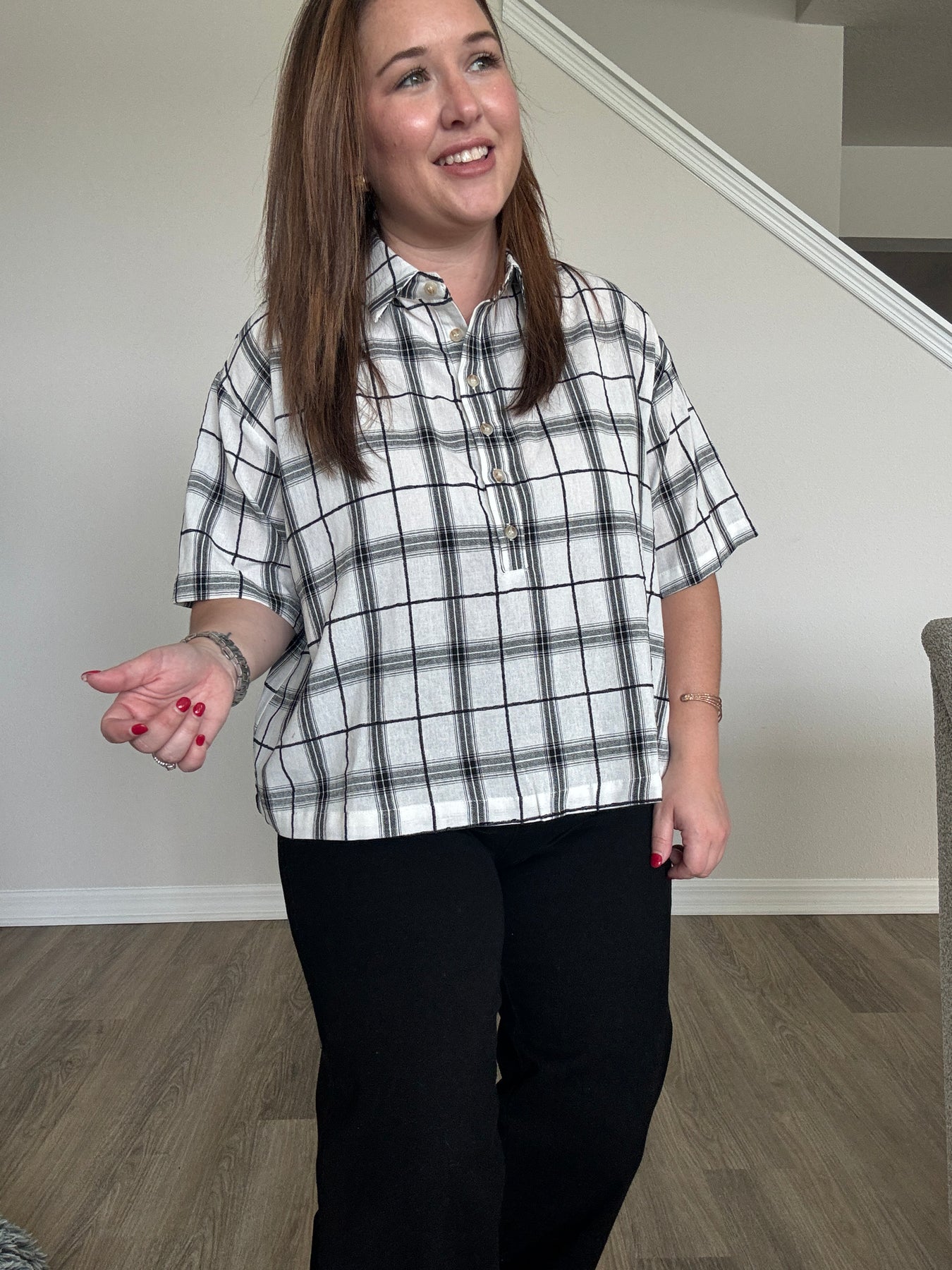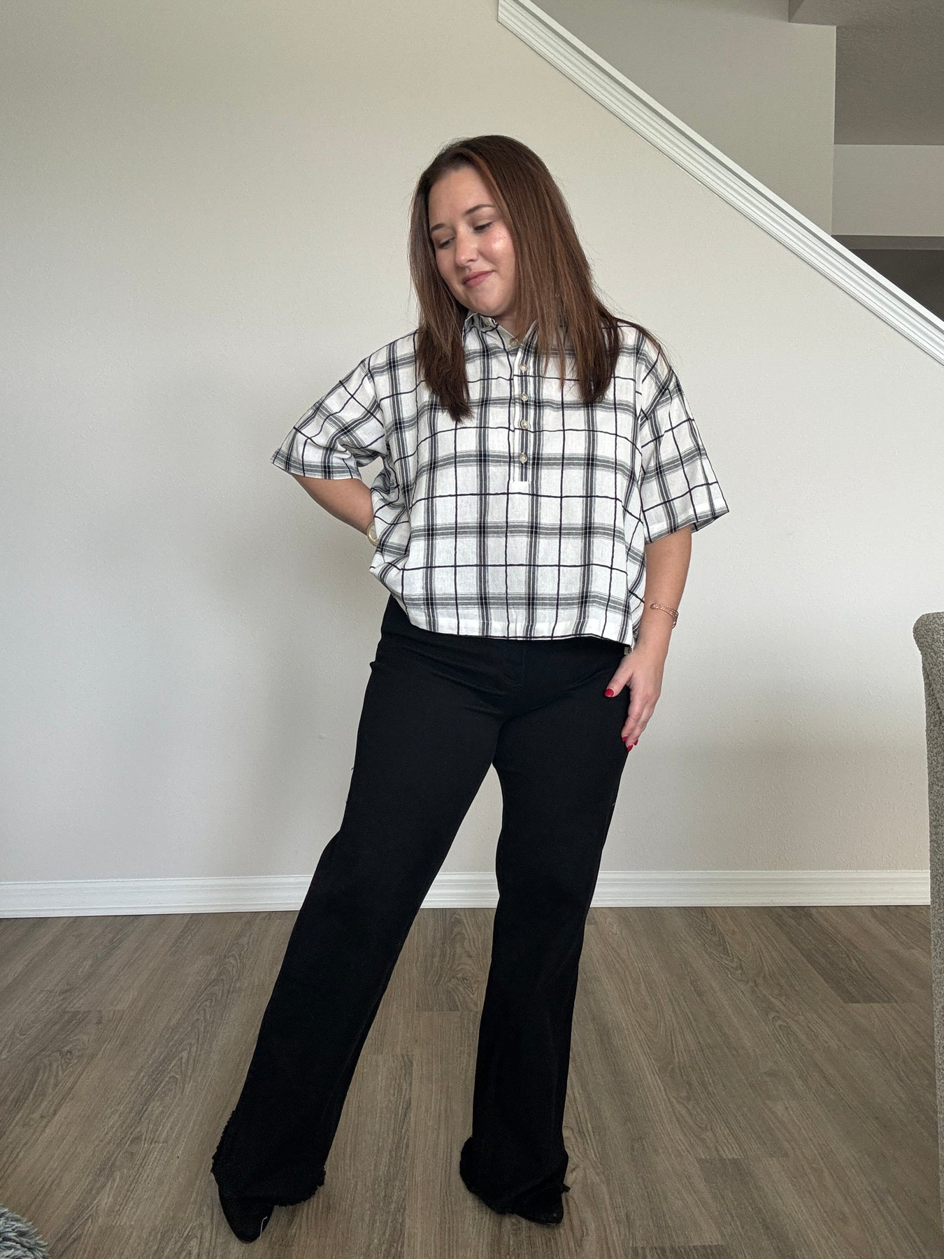A modern take on a classic favorite, this Plaid Cropped Button-Up Top brings a fun, updated edge to your wardrobe. Designed with a relaxed, easygoing silhouette and a slightly structured collar, it blends timeless charm with contemporary style. The cropped length adds the perfect amount of playfulness, making it a standout piece you can dress up or down all season long.