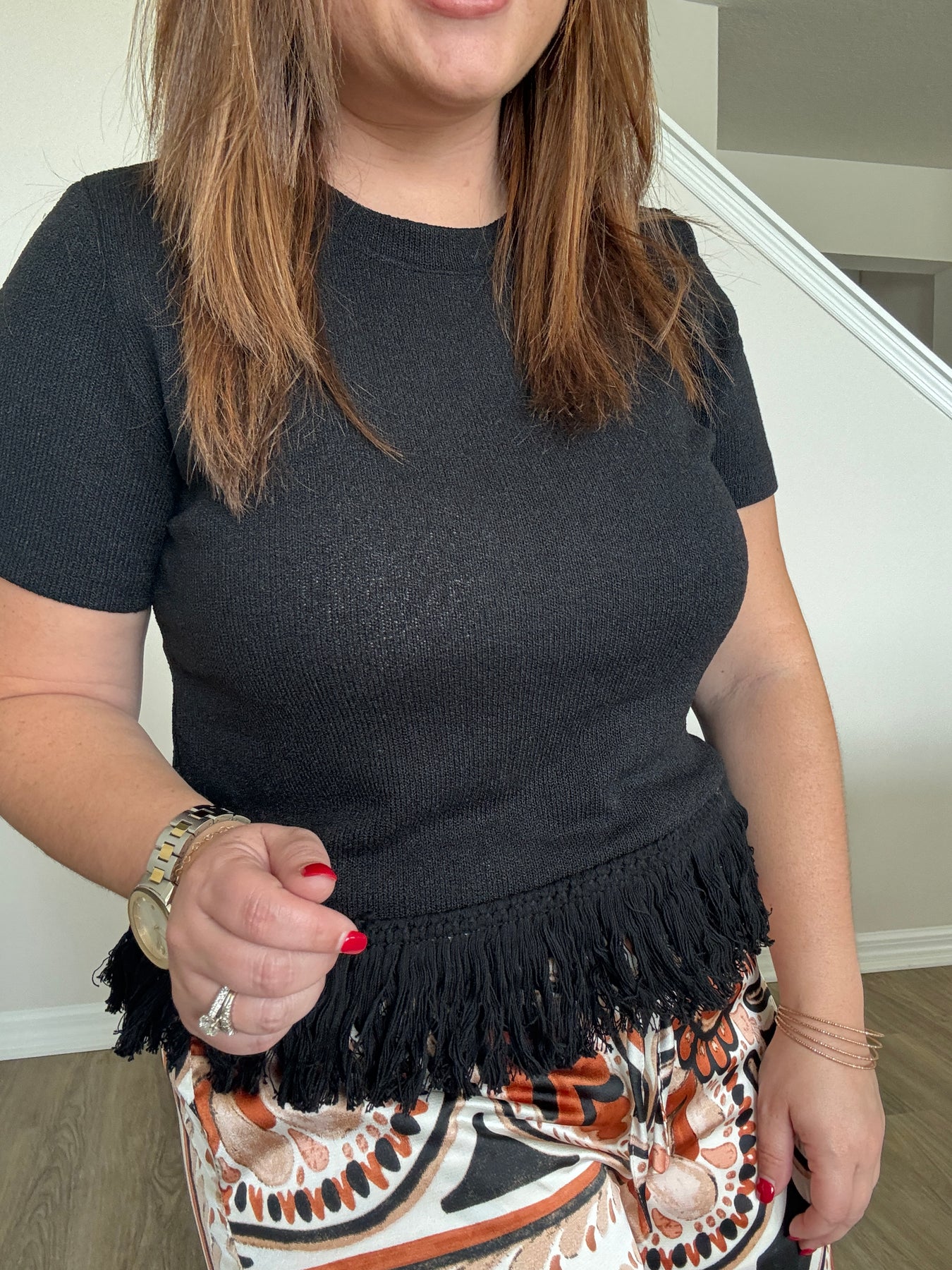 Our Fringed Tassel Hem Textured Knit Top adds a fun, stylish twist to your everyday wardrobe. Crafted from soft, textured knit fabric, this top features a round cut neckline and tassel-trimmed hem, creating movement and effortless charm with every step.