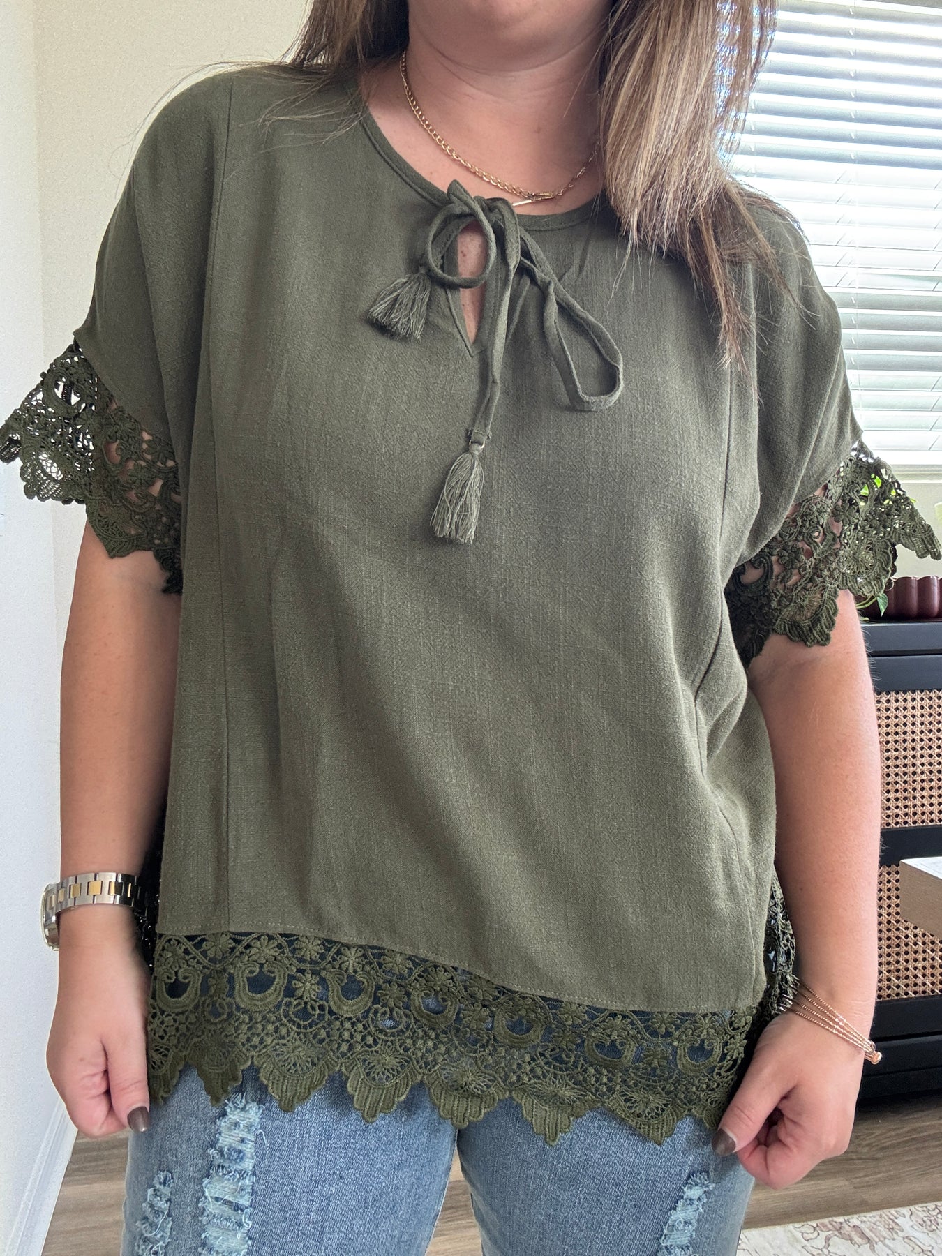 Our Crochet Trimmed Dolman Top is the perfect blend of relaxed style and feminine charm. Designed with a round cut neckline with tie detail, crochet lace trim, and flowy dolman sleeves, this top brings an easy, breezy feel to your everyday look. The lightweight fabric drapes beautifully for a flattering fit that’s both comfortable and effortlessly chic.